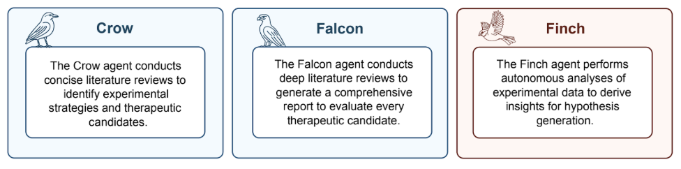 Crow and Falcon perform literature analysis: Crow produces brief topic-specific summaries, e.g. “summarize what were the experimental designs in these twenty papers”, while Falcon digs deep and writes extended technical briefs. Finch is a bit different: it lives downstream of both literature review and experiments, taking raw experimental output—RNA-seq files, flow-cytometry .fcs files, or spreadsheets—and producing quality-controlled analyses, figures, and statistical tests.