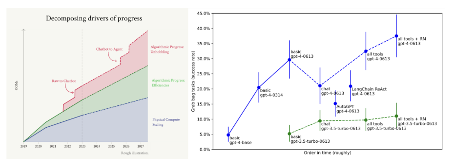 Perhaps the most important word in AI of the last year is unhobbling, coined by Leopold Aschenbrenner in his influential “Situational Awareness” paper. Unhobbling means everything that goes into improving the model after it has been trained, i.e., after the physical compute and algorithmic advances that go into basic model training have already been fixed. Here are the plots from Aschenbrenner and from METR that illustrate how powerful unhobbling is: