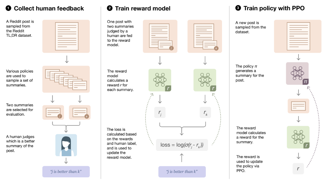 Once trained, the reward model significantly accelerates the RLHF process: in the RL fine-tuning, the AI agent now interacts with the reward model, receiving immediate feedback scores for its outputs. In essence, the reward model acts as a scalable, automated proxy for human judgment, making RLHF both feasible and efficient. Here is the whole process as illustrated by Stiennon et al. (2020), the guys who made GPT-3 into ChatGPT and kickstarted the LLM revolution: