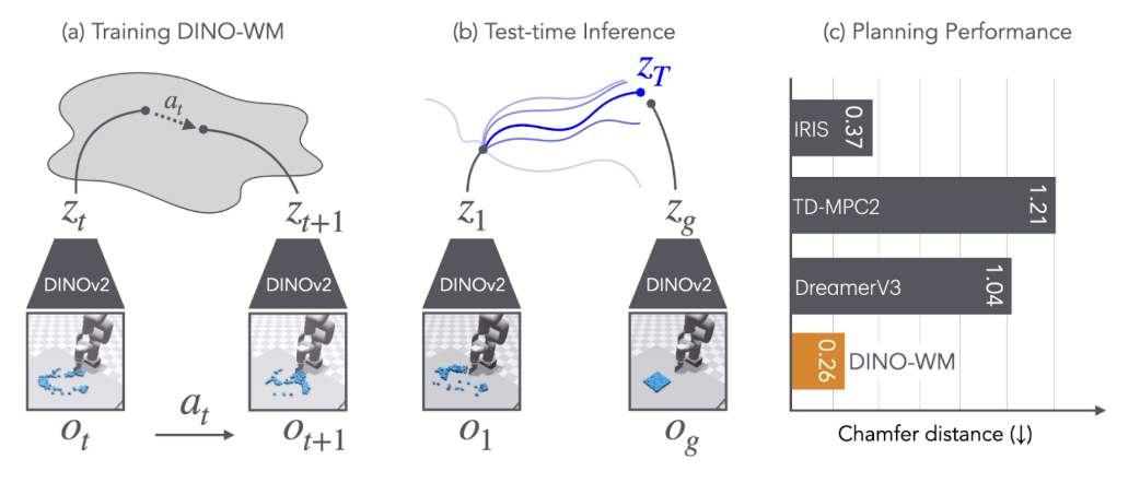 This can be a very efficient approach. One nice recent example in this family was DINO-WM by Courant Institute researchers Zhou et al. (2025); their world model based on DINOv2 embeddings (Oquab et al., 2023) could serve as the basis for successful planning via action sequence optimization: