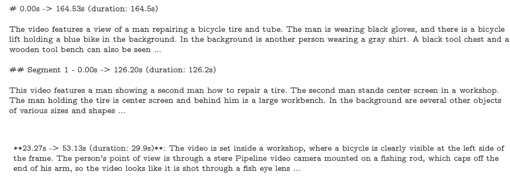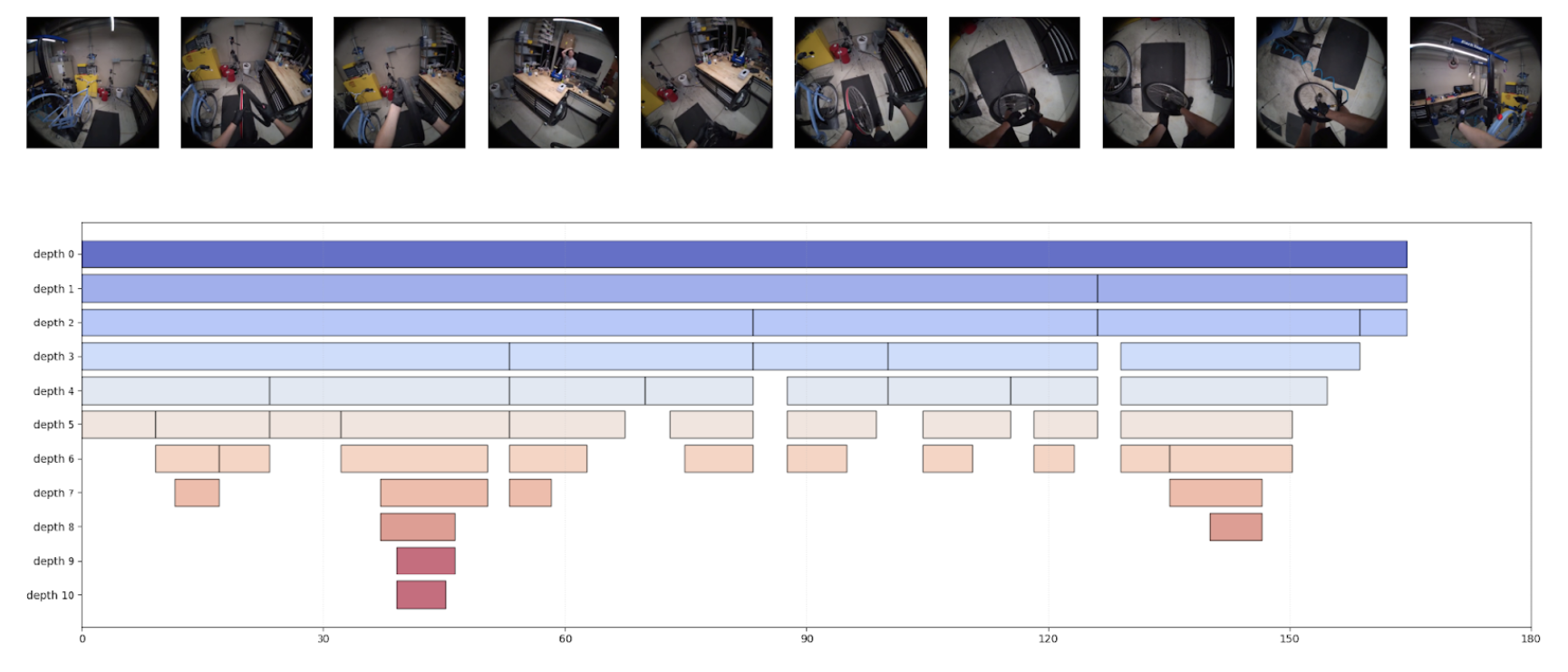 Specifically, Chen et al. (2025) build the tree by hierarchical agglomerative clustering of a per‑frame feature stream, merging adjacent segments that don’t increase within‑segment variance much. As a result, segments become monosemantic windows rather than arbitrary fixed clips. Then you can do captioning and get a multi‑scale “outline” of the video; here’s an example worked out in the paper’s appendix: