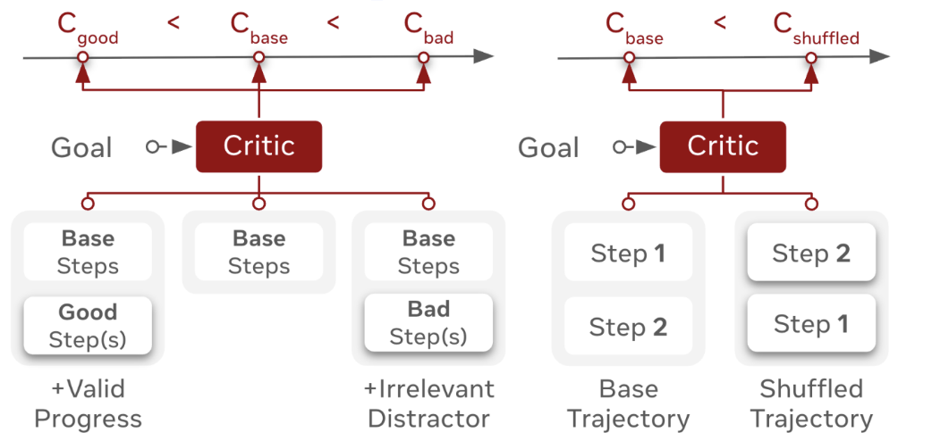 - critic (cost model), a small LM which is trained in a self‑supervised way to assign lower cost to valid progress and higher cost to distractors or shuffled steps.